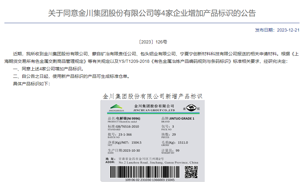 12月21日,據(jù)上海期貨交易所一則《關(guān)于同意金川集團(tuán)股份有限公司等4家企業(yè)增加產(chǎn)品標(biāo)識(shí)的公告》稱,金川集團(tuán)股份有限公司即日起使用新產(chǎn)品標(biāo)識(shí)的產(chǎn)品(品名:電解鎳NI9996)可生成標(biāo)準(zhǔn)倉單。